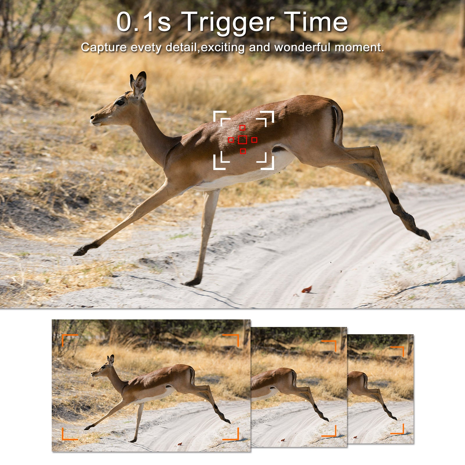 Fast trigger time in 0.1-0.6 second, 120° PIR sensor angle, wide view angle 90°. Clear night vision, up to 82ft/25m distance. Long trigger distance up to 82ft/25m(below 77°F/25°C at the Normal Level). The camera is equipped with 38pcs built-in high-efficiency infrared LEDs that function as a flash(invisible to human eyes), delivers clear photos or videos(in black & white).